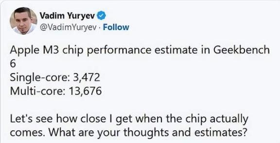 此前有跑分显示,苹果M3芯片单核基准测试成绩为3472分,多核基准测试成绩为13676分。
