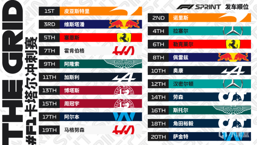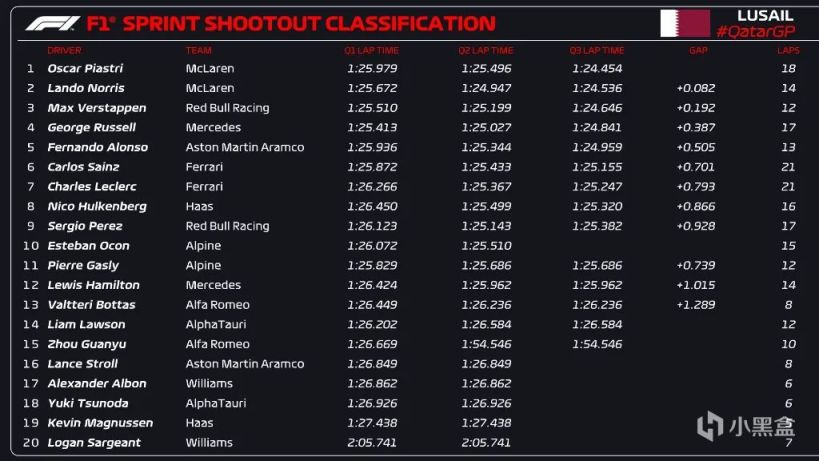 周六冲刺赛SQ1,斯托尔、阿尔本、角田裕毅、马格努森和萨金特被淘汰,周冠宇则因为角田单圈被删除而惊险晋级!SQ2,汉密尔顿、劳森、周冠宇都在最后一圈四轮超出了白线,均止步于SQ2;SQ3,皮亚斯特里拿下冲刺赛排位赛第一,诺里斯第二,落后0.082秒,维斯塔潘第三,拉塞尔和阿隆索分列四五。