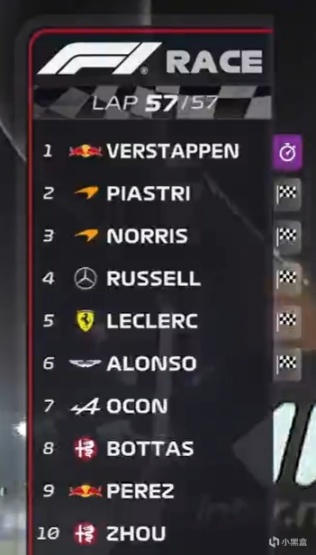 Lap57:维斯塔潘以第一名冲线,夺得本场比赛的冠军。皮亚斯特里第二,诺里斯第三。拉塞尔和勒克莱尔分列四五。周冠宇最终排名第十,由于佩大师的罚时,周冠宇以P9完赛,这也是他本赛季第三次拿分,阿罗双车均获得积分!
