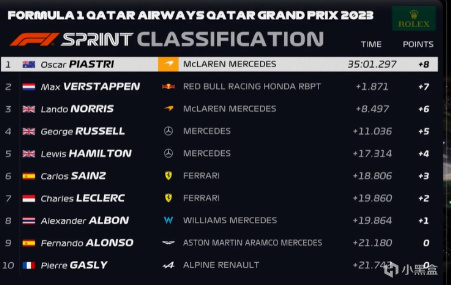 最终,维斯塔潘稳收杆位。拉塞尔第二,落后0.441秒,原本排名第三的皮亚斯特里在接受采访时,得知自己的单圈也因超出赛道限制被删除,掉至第六,汉密尔顿递补至第三!