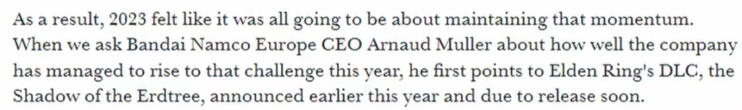 此前万代南梦宫欧洲ceo在接受采访时称《艾尔登法环》dlc会很快到来,就是不知这很快是多快。我说个数,TGA公布!