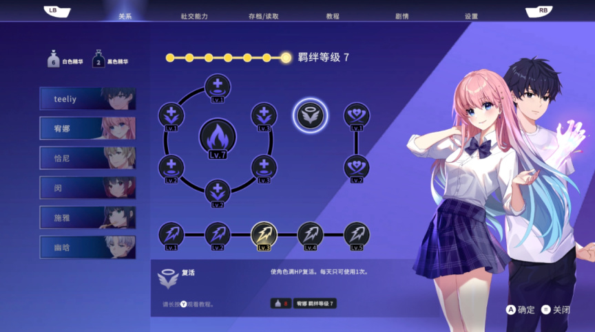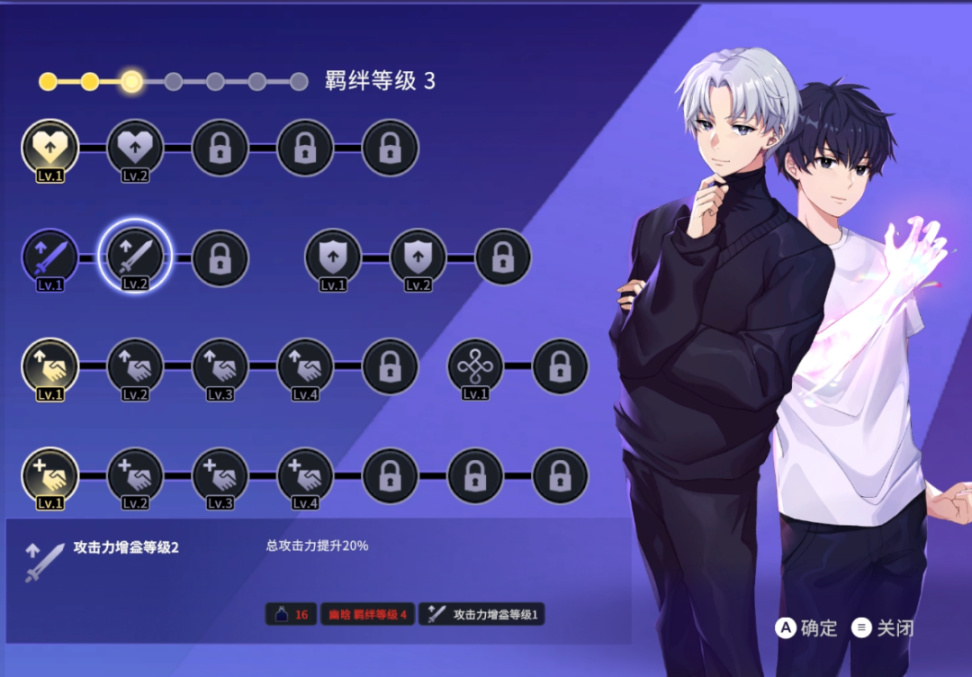 每个角色都有一套技能树,解锁后续的技能就需要提升羁绊等级。帮助不同的女主找物品也能提升一部分的属性。虽然这套系统为角色提升羁绊提供了正向循环,但也不可避免的出现了玩家因为角色的喜好而耽误了自身的性能。