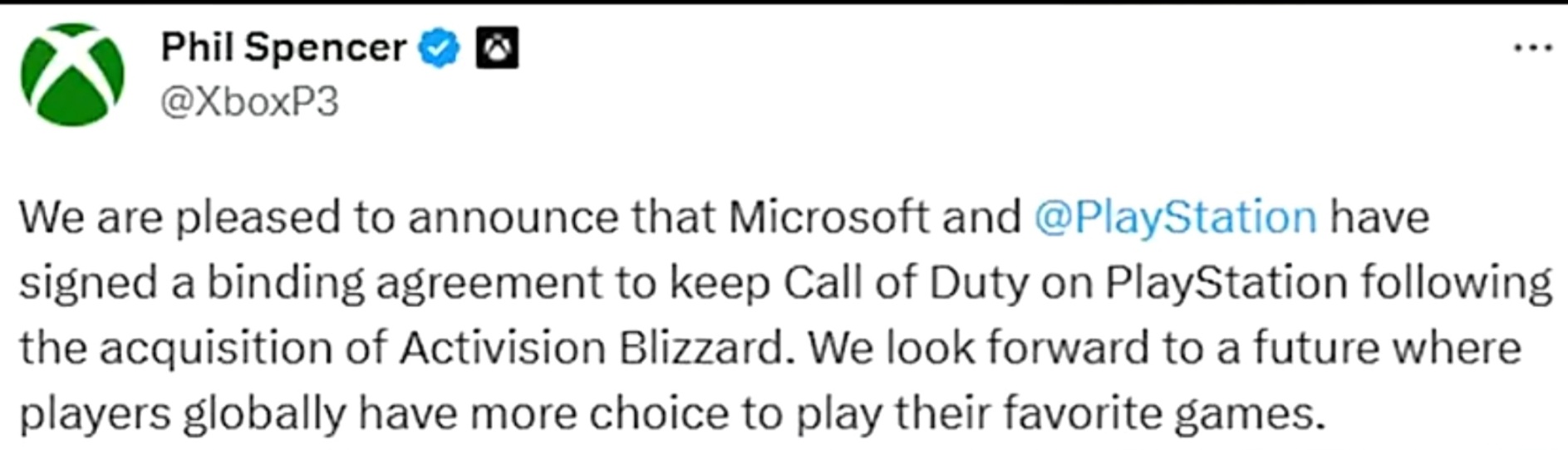 翻譯:我們很高興地宣佈,微軟和@PlayStation已經簽署了一項具有約束力的協議,在收購動視暴雪之後,繼續在PlayStation上使用《使命召喚》。我們期待着未來,全球玩家有更多的選擇來玩他們最喜歡的遊戲。