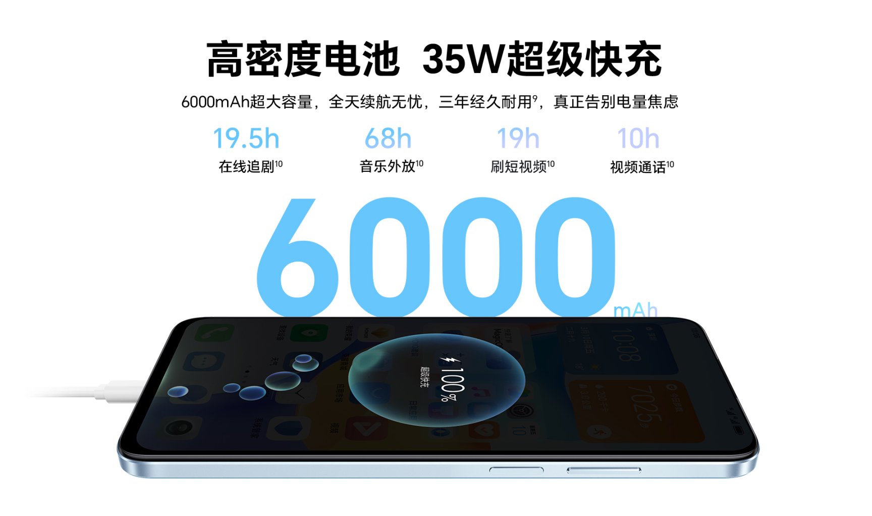 - 续航:6000mAh 电池,支持 35W 快充,电池千次循环寿命保持 87%;