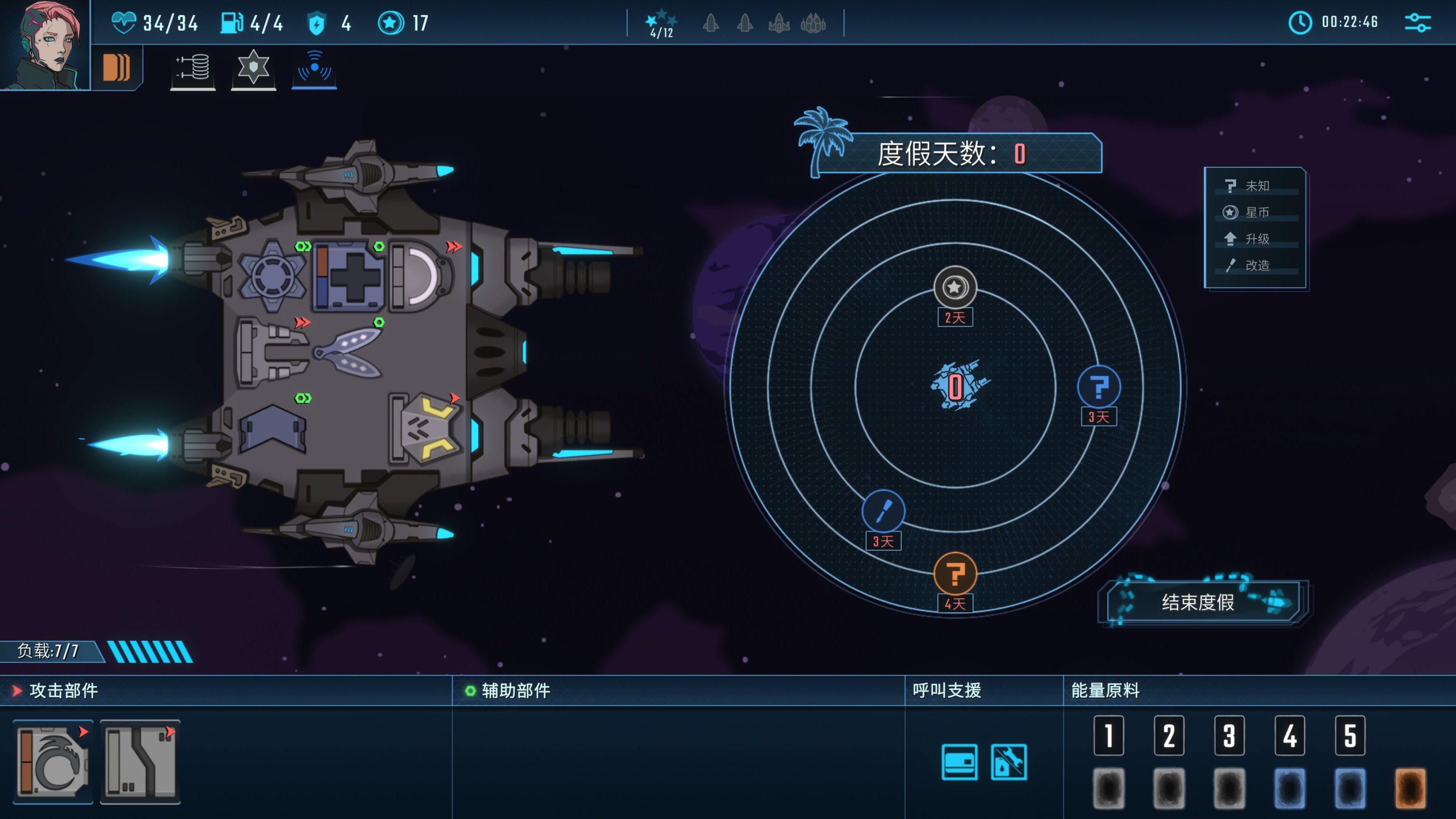 除了自由度,本作最令我赞口不绝的,除了丰富的职业选择,还有游戏随机性的体现——玩家在每一次战斗结束后都将进入“度假时间”,可以在规定的度假天数内前往其他星球完成事件,有些事件都需要玩家进行抉择,商店、星币、改造、未知……事件的种类虽然算不上丰富,但也涵盖了所有资源类型的获取与使用;此外,部件也能通过各类事件打上词条,跟部件原有的效果产生连锁反应,进一步增幅伤害;通过战斗和事件获得的宝物(类似尖塔的遗物),效果一般比较强力,并且还能提供体系,增强玩家构建BD的成就感。