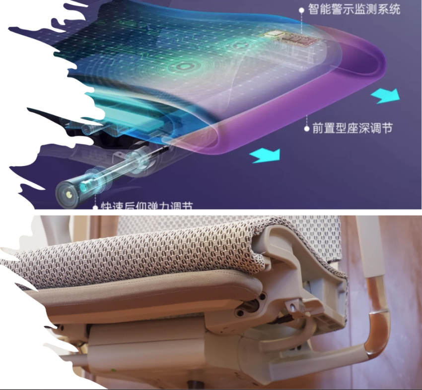 部分新款高端椅子底盘内部提供弹力反馈机制的不再是弹簧而改成了更高端玻纤弹片,这个跨越就像手机的4核处理器变成8核,在旧有功能的基础上大大提升了使用体验感,后仰更加丝滑轻盈(具体见后面解释),而且功能调节性能做的更丰富了,比如座垫-背垫前倾功能。
