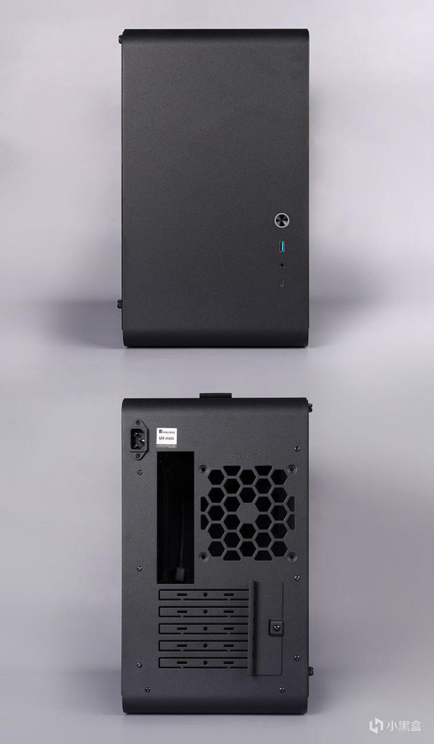 最后看看乔思伯 U4 Mini MATX 机箱,具体尺寸:440×222×385mm,采用通体黑色设计(另有纯白款可选),外观采用一体式的弧形面板打造,具备圆润的造型特点,看着会比较的时尚。机箱左侧依旧是喜闻乐见的钢化玻璃侧板,右侧则采用了 MESH 网孔面板,为了是让其实现面板左右互换的特点,让玩家在展示与散热两种需求上自由选择。