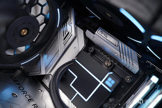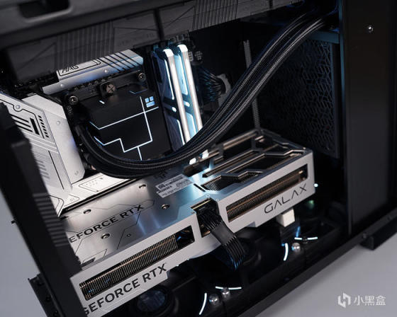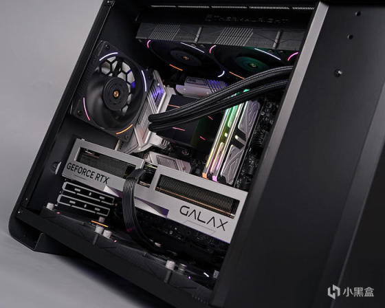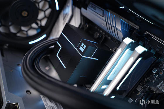 装机选用 360 一体式水冷散热方案,选用利民 CORE MATRIX 360 BLACK 一体式水冷,采用利民最新的 CORE V1.0 独立水泵架构设计,主打外观 MATRIX 矩阵幻视风格,冷头采用全铝合金楔形镶嵌工艺,结合交错层叠的灯光线条光效,有着别具一格的灯光效果。
