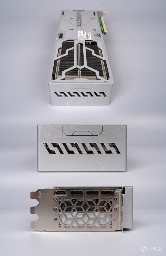 采用 3 PCI 挡板设计,表面镀镍处理,大面积几何开孔,用于增强进出风,对应给到的接口,分别为 3 个 DP 1.4a 接口及 1 个 HDMI 2.1 接口。