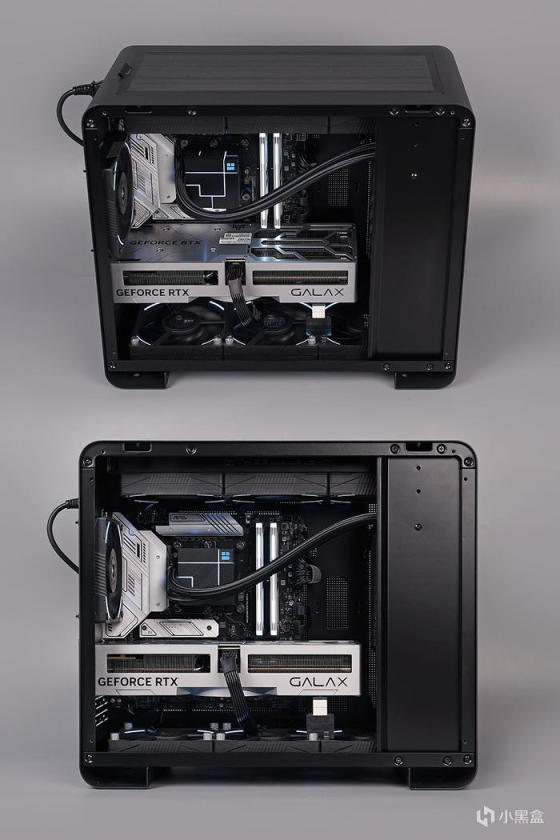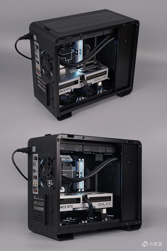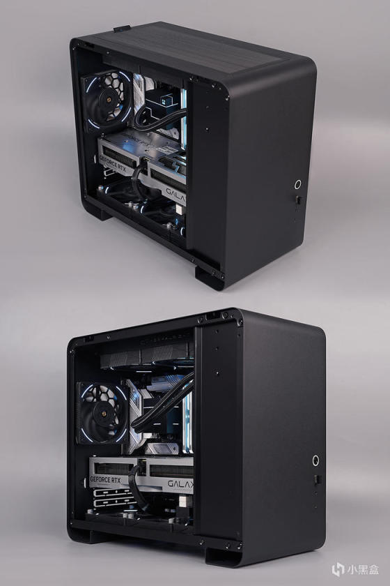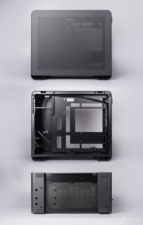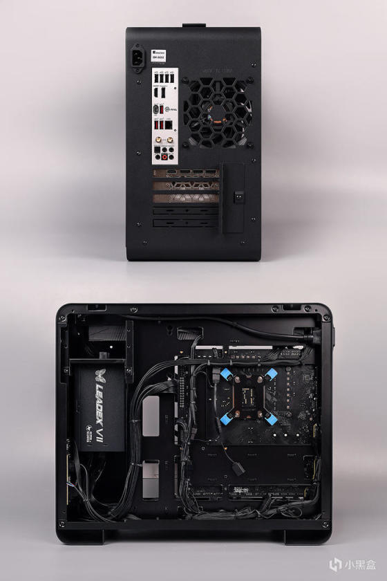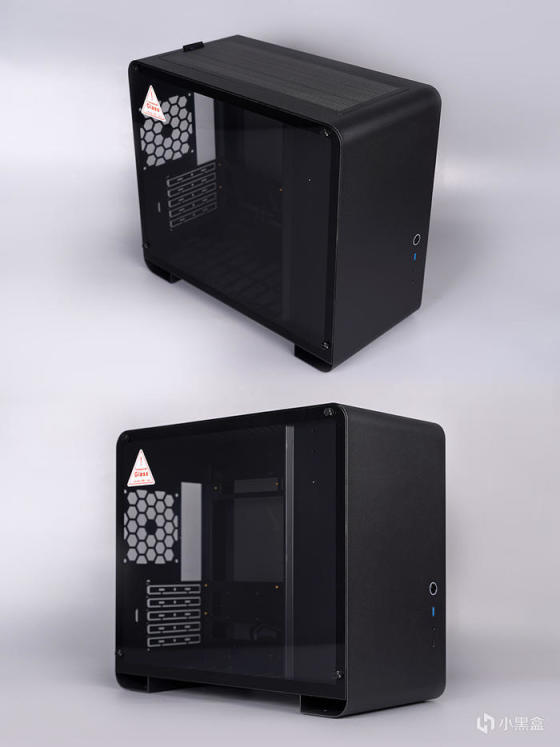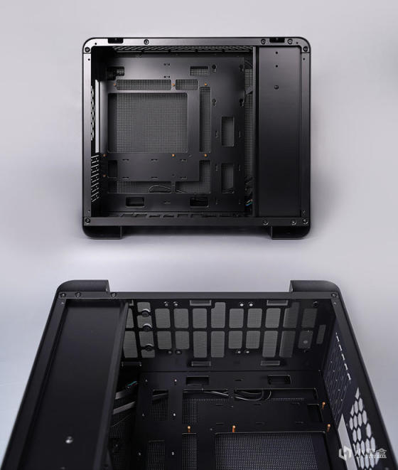 机箱内部,采用背插式设计,对应位置带有接口开孔,亦支持常规主板安装,向下兼容 ITX 主板规格,前置电源安装位,带有装饰挡线板设计。