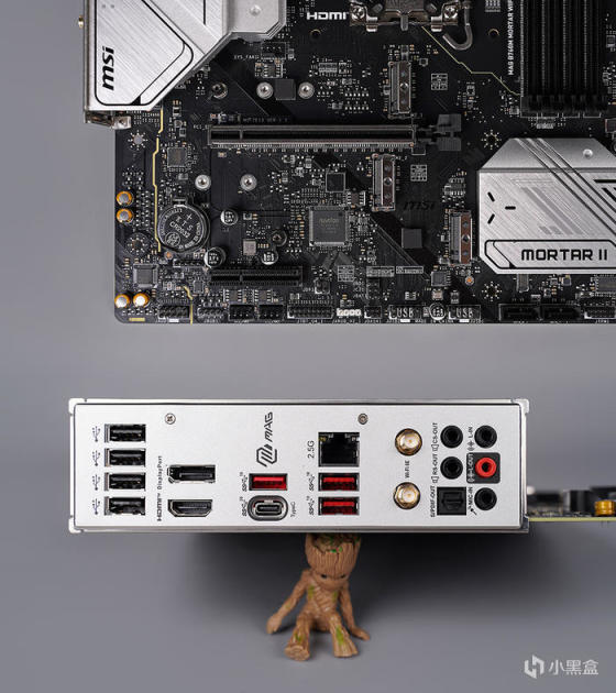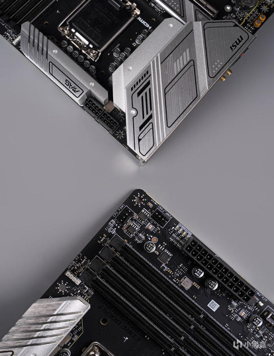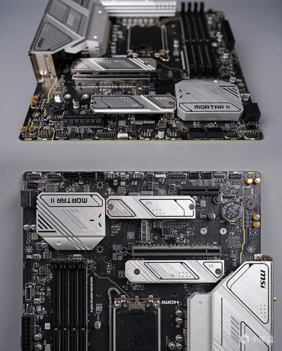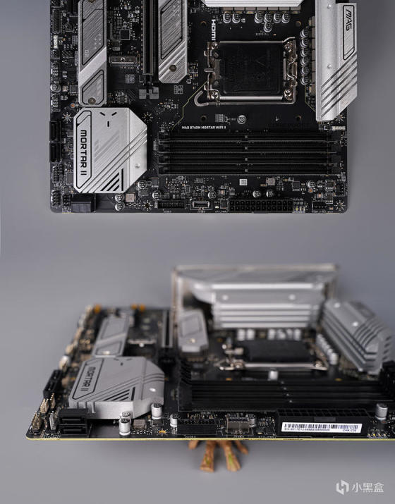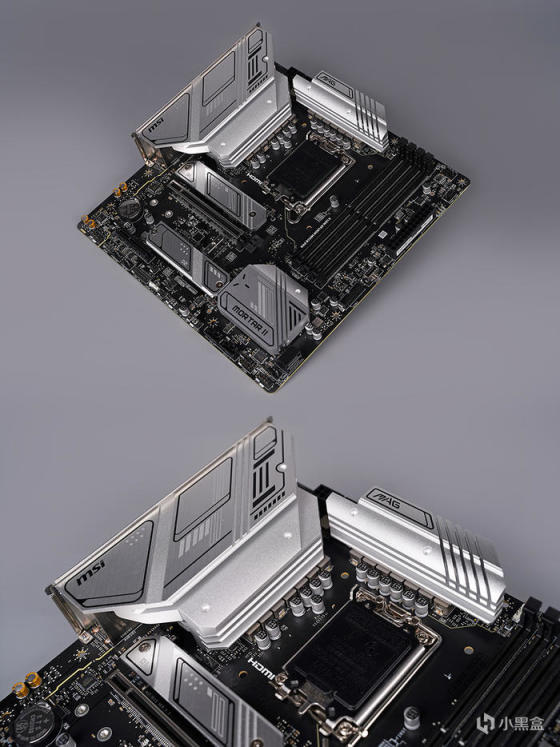 主板采用标准 MATX 版型规格,外观为黑色的 PCB 搭配大面积的银白色金属散热模块,散热模块造型线条简洁明了,表面辅以品牌及型号等元素修饰点缀,增添视觉效果,整体配色非常适合用来搭建白色主题的装机方案。