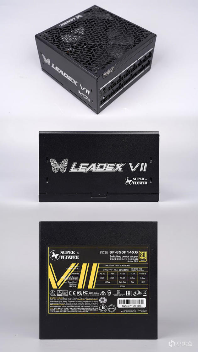 电源采用黑色外观设计,标准 ATX 电源尺寸规格,具体尺寸为 150mm(长)× 150mm(宽)× 86mm(高)。两侧型号 LEADEX VII 及振华 LOGO 图案修饰。一面规格贴标,其中 +5V 和 +3.3V 输出电流分别为 20A,合计输出 100W,而+12V 输出电流为 70.8A ,可提供最大 849W 功率。具备高于 ATX 3.0 规范的 235% 瞬时峰值功率输出以及动态性能下的超载力,通过 80PLUS 金牌认证 Cybenetics (115V & 230V)双重白金等级认证,具备超过 90% 的转换率。