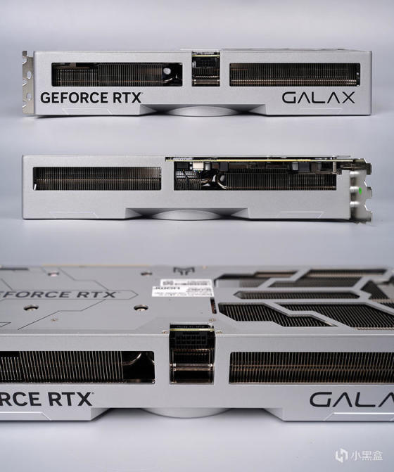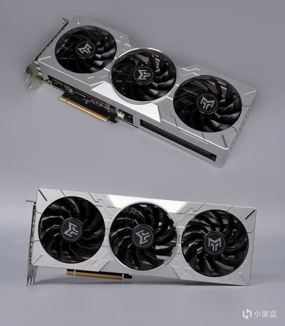 显卡采用的是一体压铸铝合金材质,金属感十足的银灰色,外观不同以上代的圆润,这代造型方正刚硬,表面辅以不规则的几何与交叠线条修饰,以宇宙魔方为灵感,呈现出错落有致的美感,细节之处做了 CNC 高光高亮处理、金属材质增加产品质感的同时,亦可起到被动散热的效果,提升散热效能,配备 3 个 102mm 超大净霜风扇,三折扇叶设计提供更强风力和更大风量。
