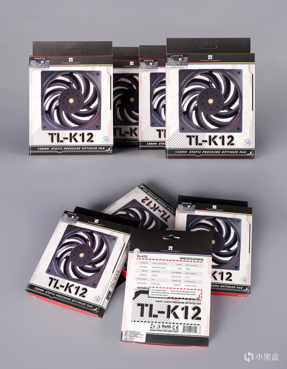 机箱匹配水冷风扇,选用其零售款的 TL-K12 盒装,包装正面带有风扇灯光效果展示,背面参数列表,具体规格:最大转速 2150RPM±% ,噪音 ≤27dBA,最大风量 69CFM,最大风压 2.87mmH20 等。