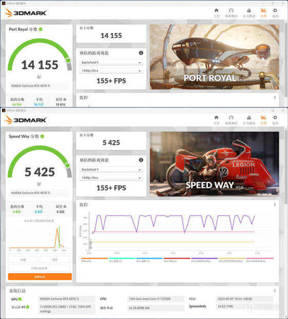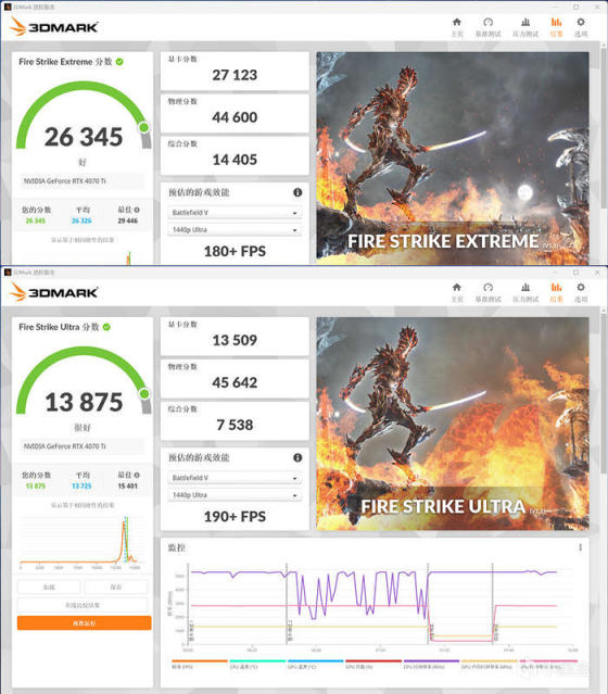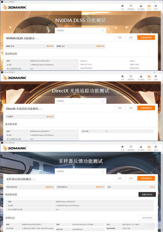 影驰 GEFORCE RTX 4070TI 金属大师 OC,3DMARK 各种模式下的得分如上。