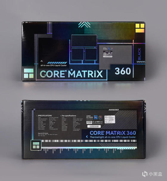 搭配一体式水冷,利民 CORE MATRIX 360 BLACK 一体式水冷,包装的图案呼应其产品的设计语言,另标注有型号等信息,其表面印刷用了大量的 UV 效果,看着颇为的高级。背面则标注产品规格等信息。