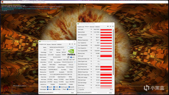 FURMARK 满载测试,过程 20 分钟左右,影驰 GEFORCE RTX 4070TI 金属大师 OC,GPU 频率 2400MHz 上下,显存 1312MHz 上下,核心温度 73.7°C(结温 86.4°C),显示功耗 282W 左右。