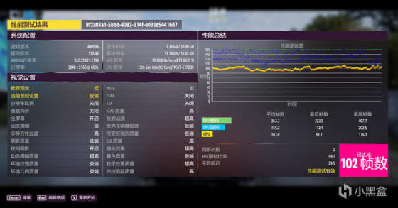 FORZA HORIZON 5,开启光追,BENCH 测试,4K 分辨率,平均 102 FPS。
