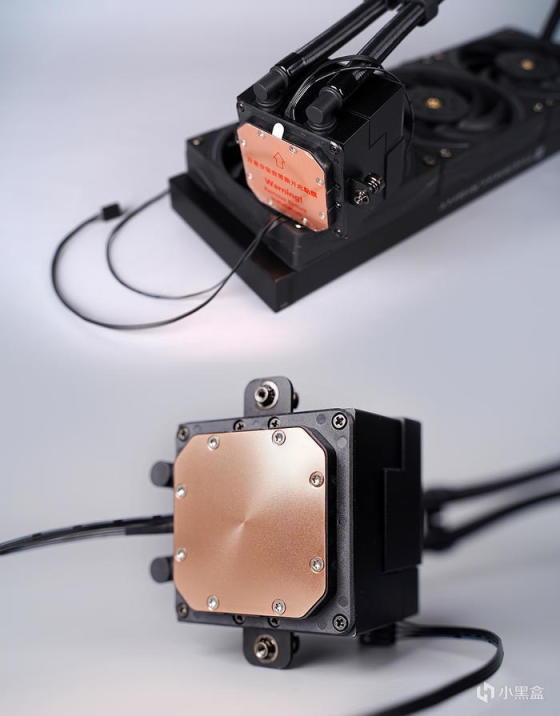 水冷本体采用通体黑色外观设计,风扇预装在冷排上面。冷排侧面带有利民 LOGO 修饰,编织包网的橡胶水管,官标长度 45cm,另管子搭配有塑料卡扣,便于水管的塑性,给到更好的视觉效果。主打外观 MATRIX 矩阵幻视风格,冷头采用全铝合金楔形镶嵌工艺,结合交错层叠的灯光线条光效,有着别具一格的灯光效果。