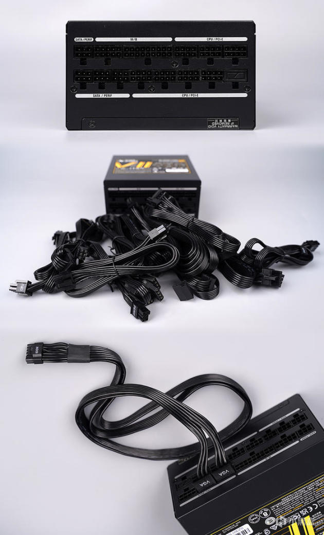 全模组接口:2 个二合一的 24PIN 模组接口、7 个 CPU / PCI-E 模组接口、4 个 SATA 及 FERIF 模组接口,位置搭配有文字的区域示意。搭配黑色柔性扁平化模组线材,采用 16AWG 铜芯线径和合金铜端子制成,可支持高达 600W 功率输出,符合 PCIe 5.0 规范,为此 12VHPWR 连接线,采用的是更为成熟稳定的双 8PIN 方案,避免该接口所带来的不稳定状况发生。