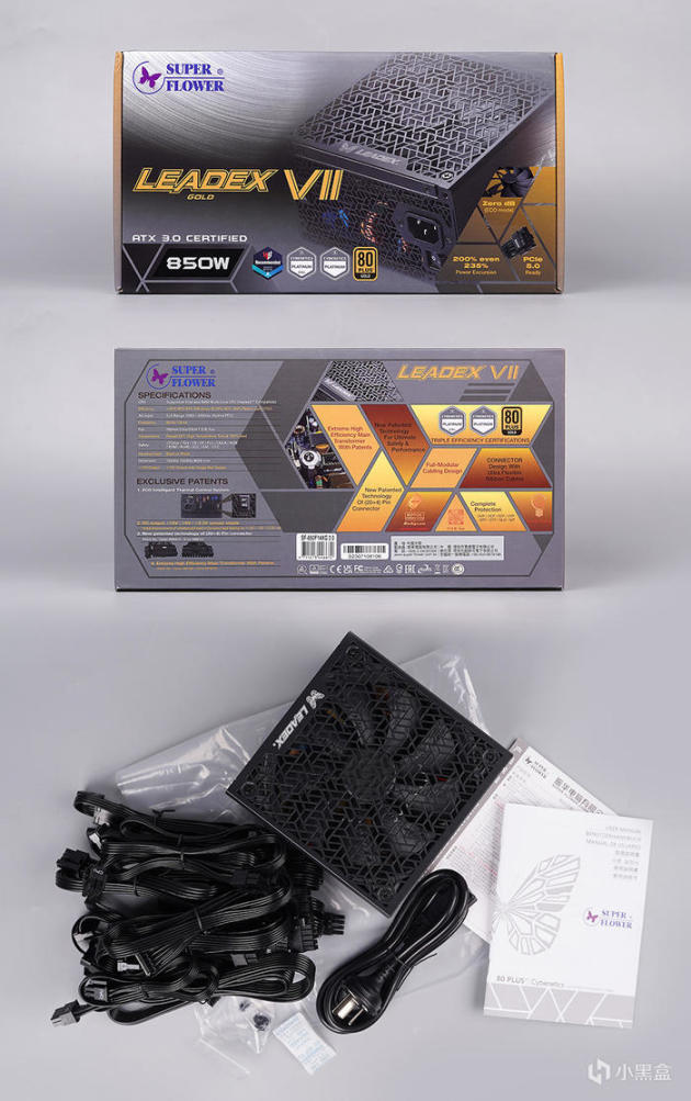 振华 LEADEX VII 850W ATX3.0 金牌全模电源 ,外包装设计很有视觉冲击力,采用金属灰色,辅以金色搭配,正面电源外观展示,左边型号及认证标识、右边标注、风扇 0dB ECO 模式、 235% 超 ATX 3.0 规范、PCIe 5.0 线材支持,左上角振华 LOGO。背面则为产品具体规格等信息。内附件有说明书、螺丝、模组线、调味包、还有电饭锅线。