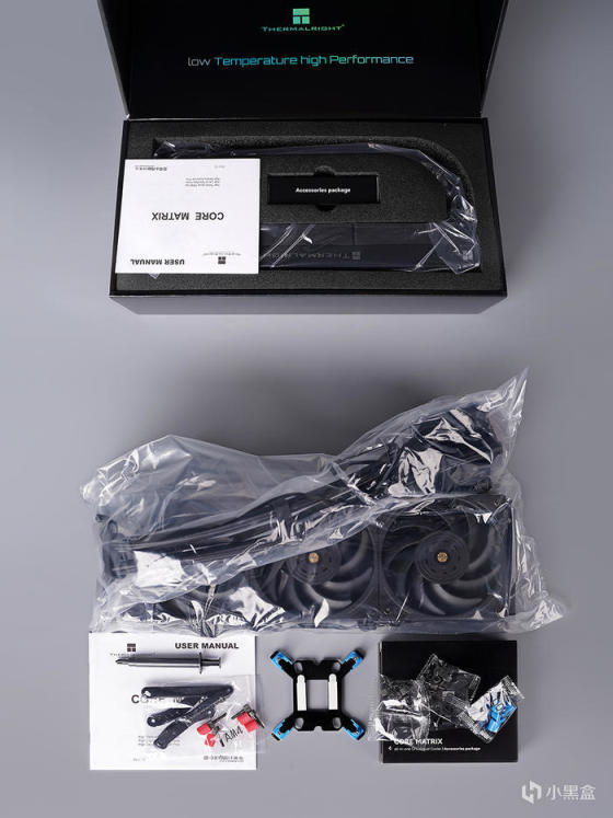 包装里头水冷产品一体式包裹,居中配件盒,边上说明书,看着颇为的简洁明了。附件扣具支持牙膏全家及 AM4/5 平台安装,另附带有一管 TF7 的散热硅脂。