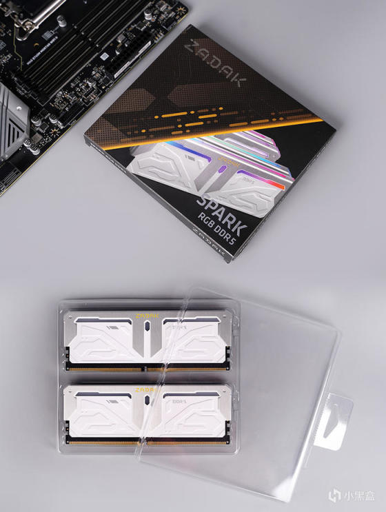 搭配宇瞻 ZADAK SPARK RGB DDR5 6400Hz 16GB×2 套装,包装印刷有内存本体展示,标识型号烫银处理,里头内存采用透明塑料盒包裹保护。