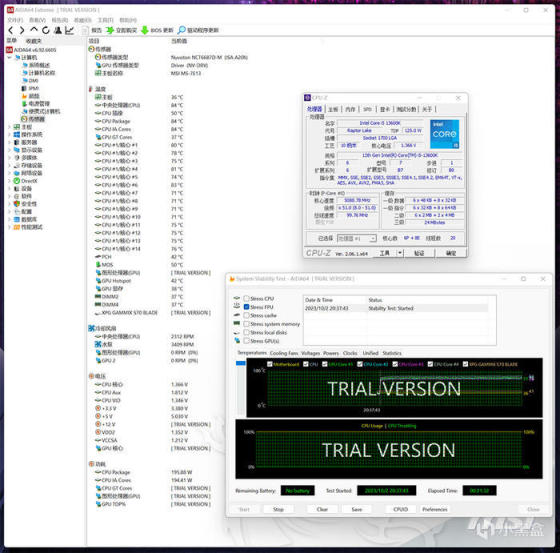 CPU 满载温度表现,AIDA64 单烤 FPU 压力测试,20 分钟左右,P-CORE 温度最大值 83°C,E-CORE 温度最大值 76°C,CPU 显示功耗 195W 左右。