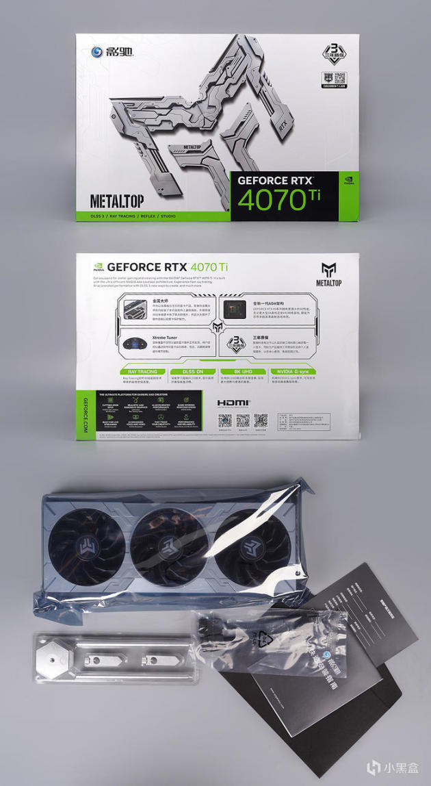 显卡选用的是影驰 GEFORCE RTX 4070TI 金属大师 OC,采用银白色的包装,金属大师系列 LOGO 的机甲风格化造型图案装饰,上沿影驰标志和三年质保及个人送保二维码图标,下沿 METALTOP 产品序列名称,NV GEFOCE RTX 4070TI 图标,标注 DLSS / RAY TRACING / REFLEX / STUDIO 技术应用,里头所有的东西,安装指南及质保卡、显卡本体、一条 16PIN 转 2 × 8PIN 供电线、另附赠有一个铝合金材质的显卡支架。