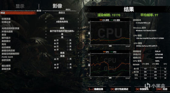 古墓丽影:暗影,开启光追,DLSS 平衡 ,极高画质,4K 分辨率,平均 97 FPS。