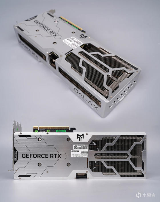 金属背板采用雾面搭配大面积拉丝面工艺处理、呈现不一样的视觉效果,上下 GEFORCE RTX 金属大师 LOGO 示意,辅以金属大师 LOGO 图案线条修饰,对应背板的散热开孔亦是金属大师 LOGO 图案样式,实际 PCB 比散热器短上一截,镂空外露大面积的散热鳍片,通过贯穿式风流增强散热,这样更易于快速的带走热量。