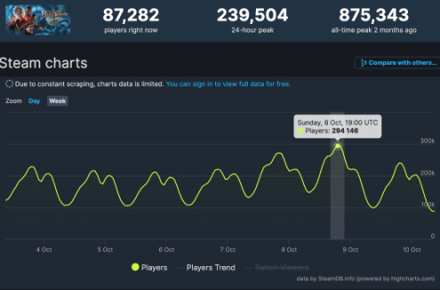 拉瑞安新作《博德之门3》已经发售两个月时间,到目前为止其热度仍然维持得不错,SteamDB显示10月份其玩家在线峰值最高仍能达到29万,平均下来每天仍有至少20多万玩家游玩。