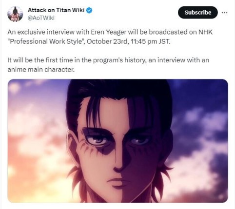根据官方消息,日本NHK电视台将在10月23日播放对艾伦·耶格尔本人的独家专访,这是该节目有史以来第一次采访动漫主角。