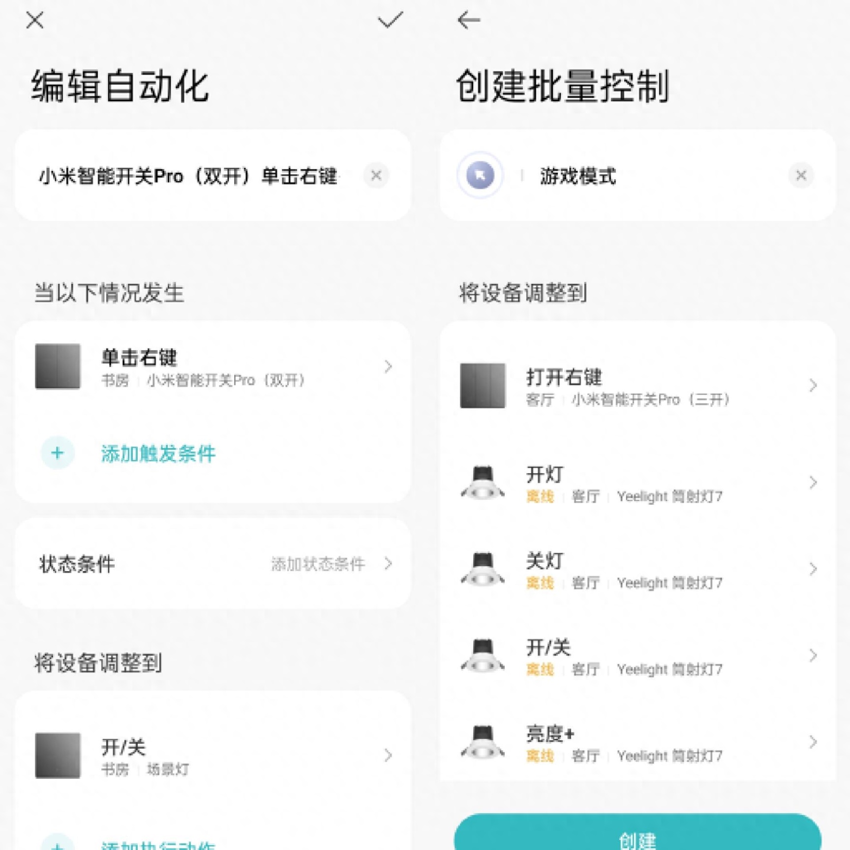 在米家APP中,你也能自定义其他场景,比如电竞模式,观影模式等,还能通过单击,开,光,一个按键可以集成多个操作方案,可玩性也相当不错。