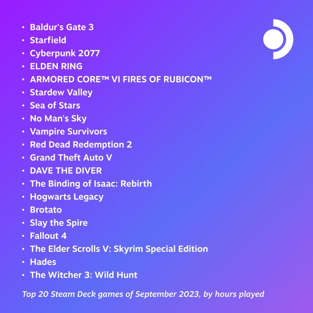 Steam Deck官推发布了2023年9月最受玩家喜欢的20大游戏(按游戏时长),8月初发售的《博德之门3》击败《星空》和《赛博朋克2077》登顶。