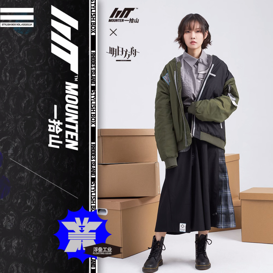 「一拾山」的设计风格和《明日方舟》的机能风很相近,多用黑、灰、蓝等作为主色调。包括在版型设计上提出「分割重组结构造型」「门襟设计」「压条设计」等,这些设计内容大都强调线条化,和《明日方舟》的科技美术风格也能够相呼应。