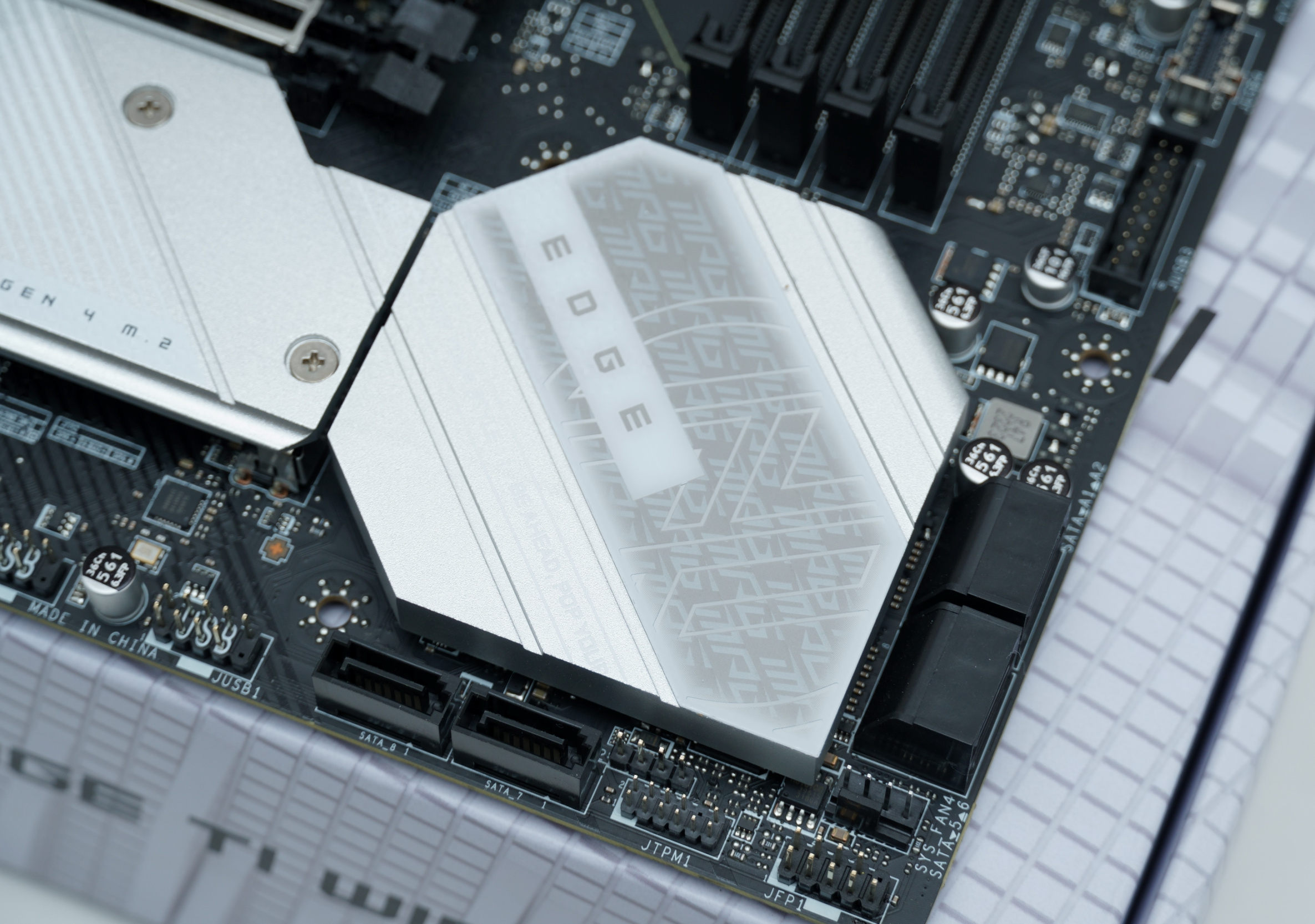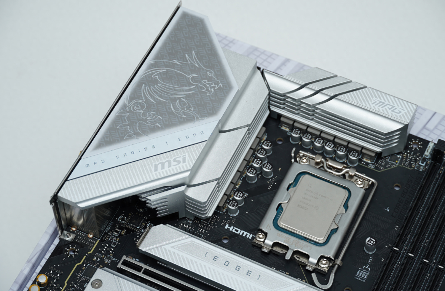 ▲微星MPG B760M EDGE TI在CPU供电,一体IO挡板与南桥芯片均被金属散热模块覆盖,光滑亮面的散热片使主板显得很有科技感。msi、EDGE、微星龙标三个logo分别镌刻在几块散热模块上,显示着这块主板的身份。