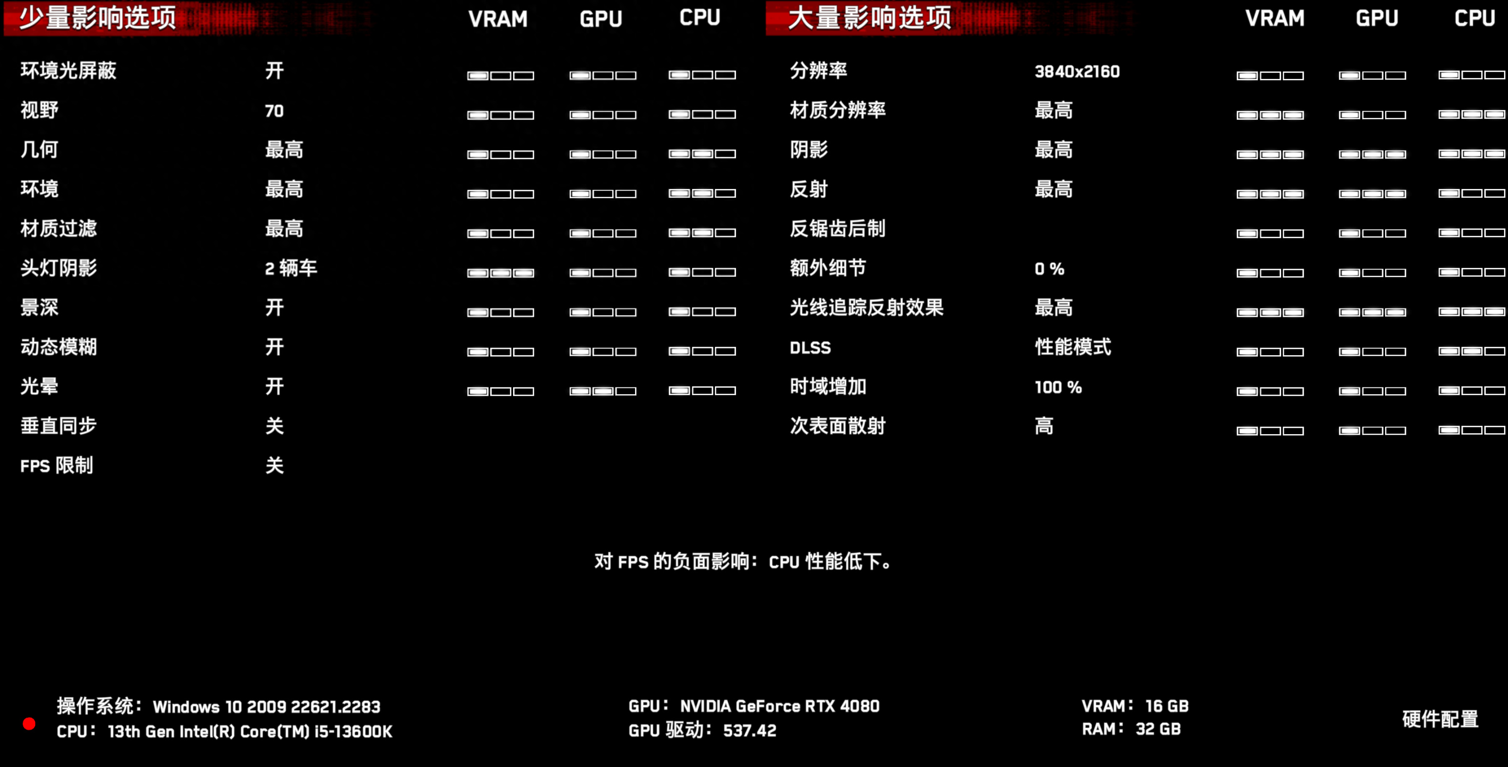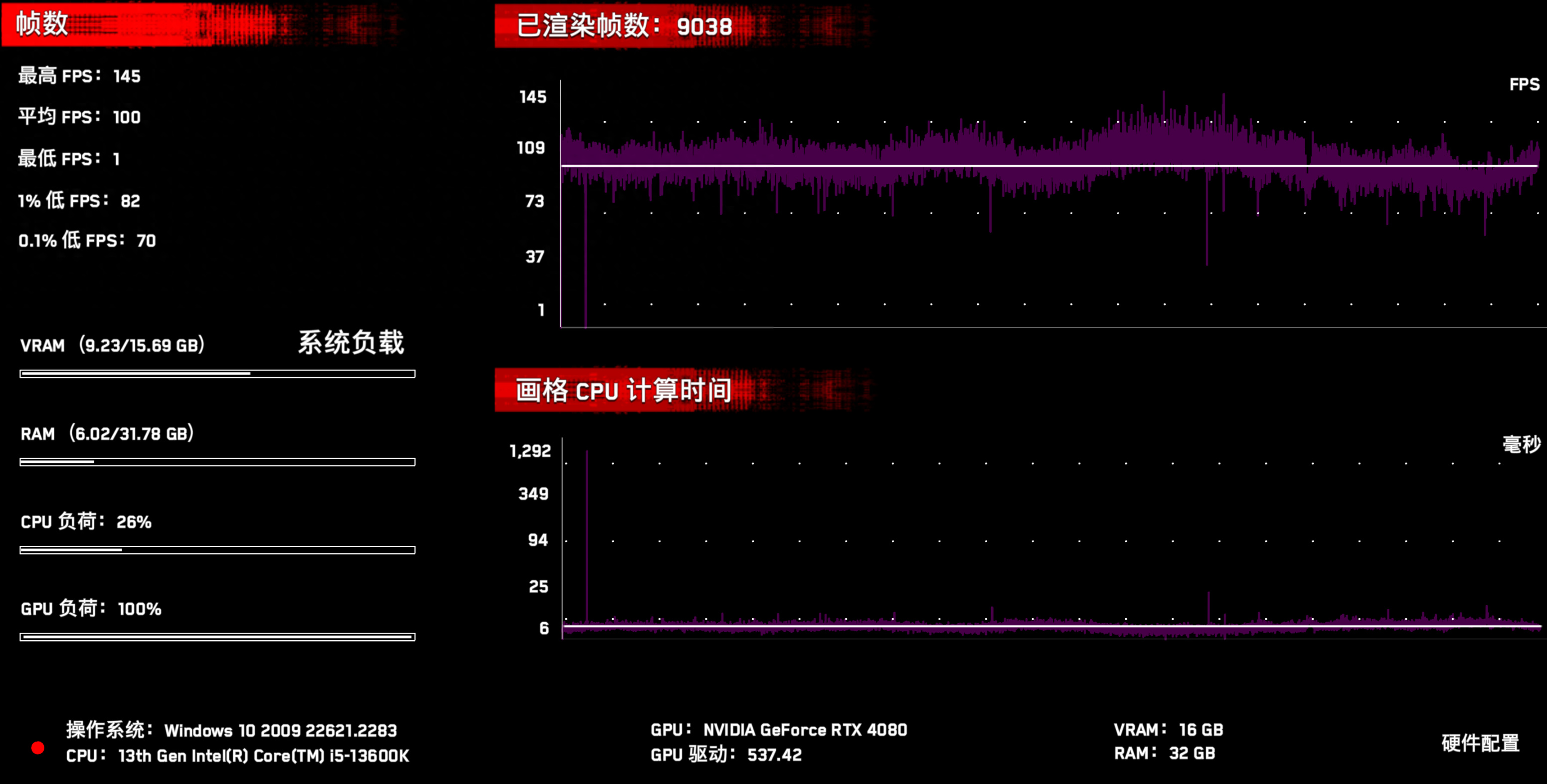 ▲在4K分辨率,预设最高画质,DLSS性能模式下,本电脑可以提供232 FPS的平均帧率,而GPU受限高达92%,简单介绍一下,GPU受限越高,证明显卡性能释放的越充分,所以至少在4K分辨率下,i5-13600K CPU搭配RTX 4080显卡不会出现高U低显的情况。
