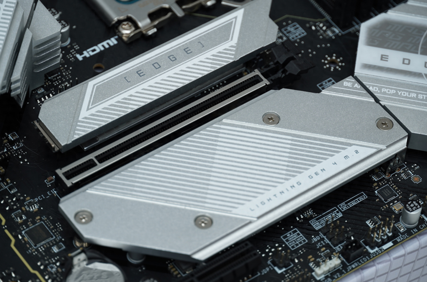 ▲在拓展性方面,微星MPG B760M EDGE TI提供了一个金属加固的PCIe 5.0显卡插槽与3个PCIe 4.0 x 4的M.2 SSD固态插槽,均被厚实的散热装甲覆盖。