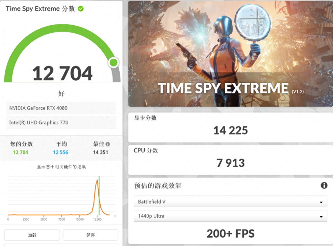 经实测,本电脑Time Spy Extreme得分12704分,其中显卡得分14225分,CPU分数7913分。
