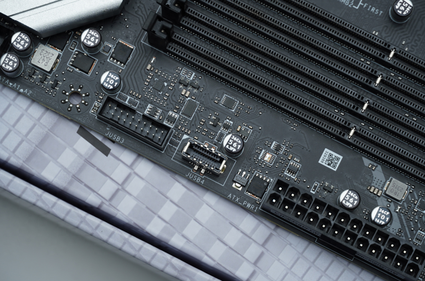 ▲除了后置IO接口,微星MPG B760M EDGE TI 还拥有前置USB Type-C接口,另外,作为M-ATX主板,B760M EDGE TI 拥有4个内存插槽,不过得益于微星的精益求精,其内存超频能力变得比之前要强很多,官方宣传为OC7800MHz+,个人实测可以轻松超频到8000MHz。