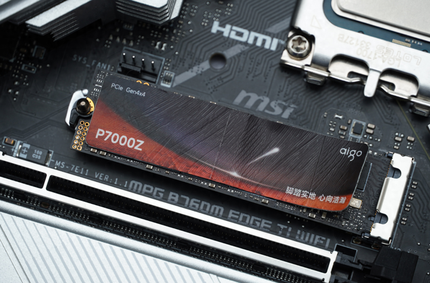 ▲在CrystalDiskMark中实测可知,aigo P7000Z顺序读取速度约为7100MB/s,顺序写入速度约为6700MB/s,已经属于PCIe 4.0 SSD的第一梯队了,而受限于B760芯片组的带宽,微星MPG B760M EDGE TI并没有PCIe 5.0的SSD插槽,所以这款固态可以说是最适合这块主板的了。