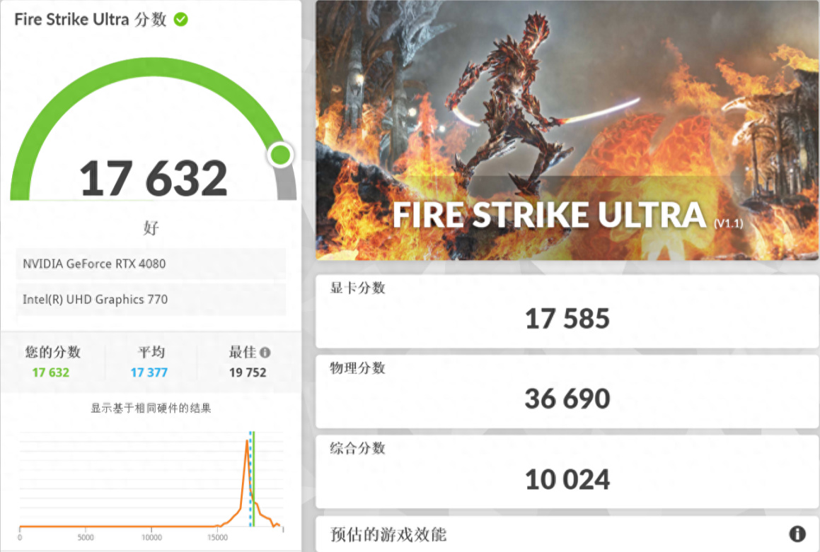 ▲我们首先使用3DMark 适用于高性能游戏电脑和超频系统的 DirectX 11 基准测试Fire Strike Ultra进行测试,其分辨率为4K。经实测,本电脑的3DMark Fire Strike Ultra得分为17632分,其中显卡得分17585分,物理得分36690分,综合分10024分。