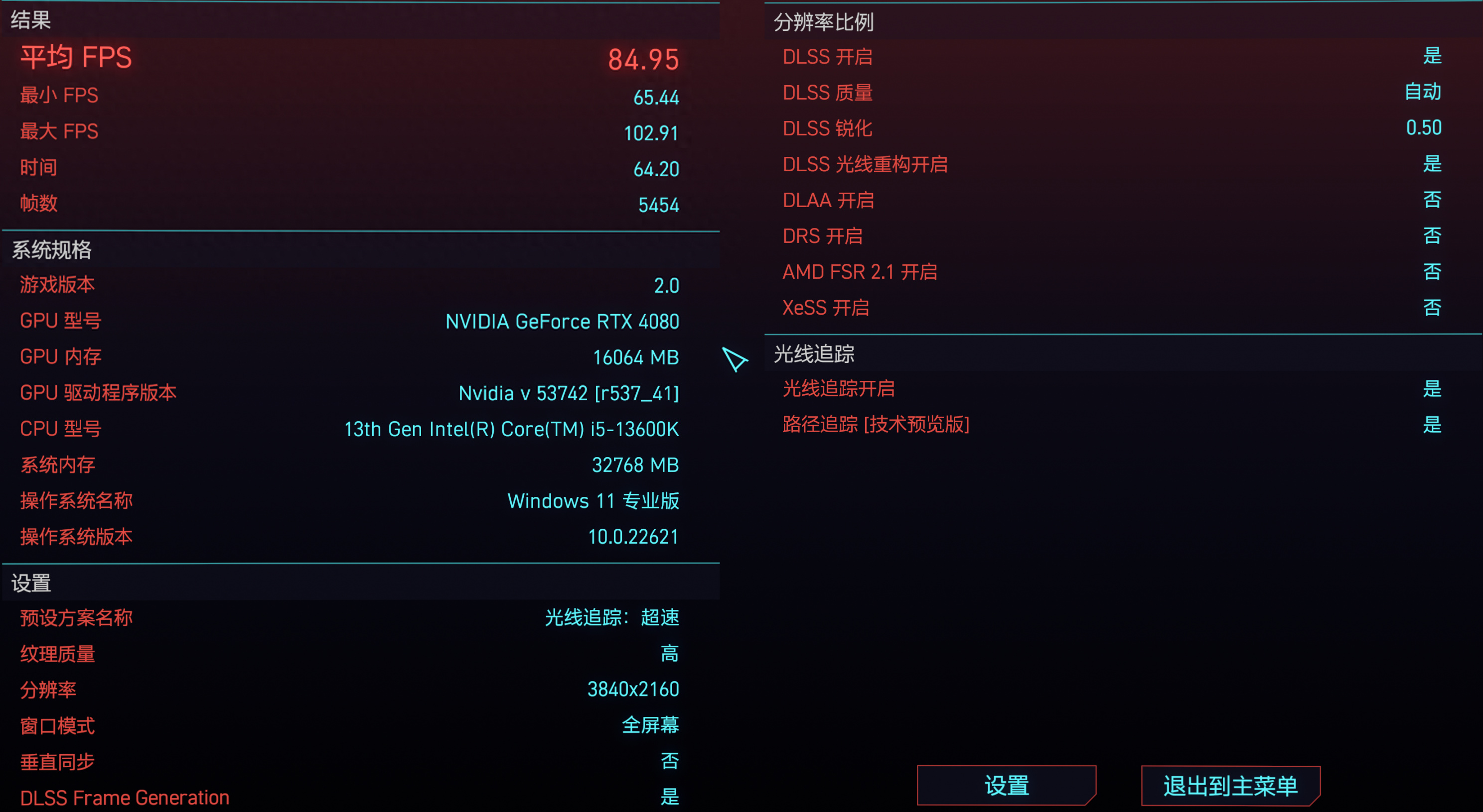 ▲《赛博朋克2077》最近有两个大动作使其再次翻红,其一是DLC《往日之影》的正式发售,其二则是2.0大版本的更新,支持了英伟达的DLSS 3.5技术,最重要的便是DLSS 光线重构功能的支持了,我们依旧使用其内置的Benchmark进行测试。