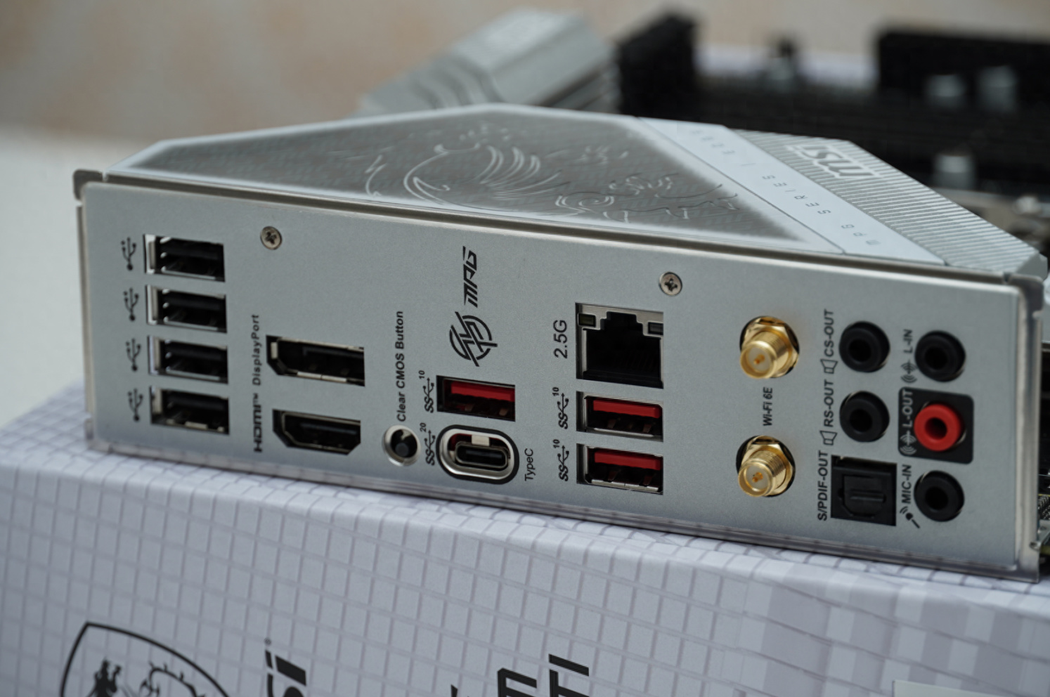 ▲作为微星旗下目前最高端的B760主板之一,一体式IO护甲必不可少,微星MPG B760M EDGE TI 提供了DP1.4\HDMI 2.1接口各一个,3个USB 3.2Gen2接口(红色,10Gbps),4个USB 2.0接口,一个USB3.2Gen 2x2 Type-C接口(20Gbps),1个2.5G有线网络接口,WiFi 6E无线网卡天线接口以及一组(5个)3.5mm音频接口与一个光纤音频输出接口,算是比较齐全的。