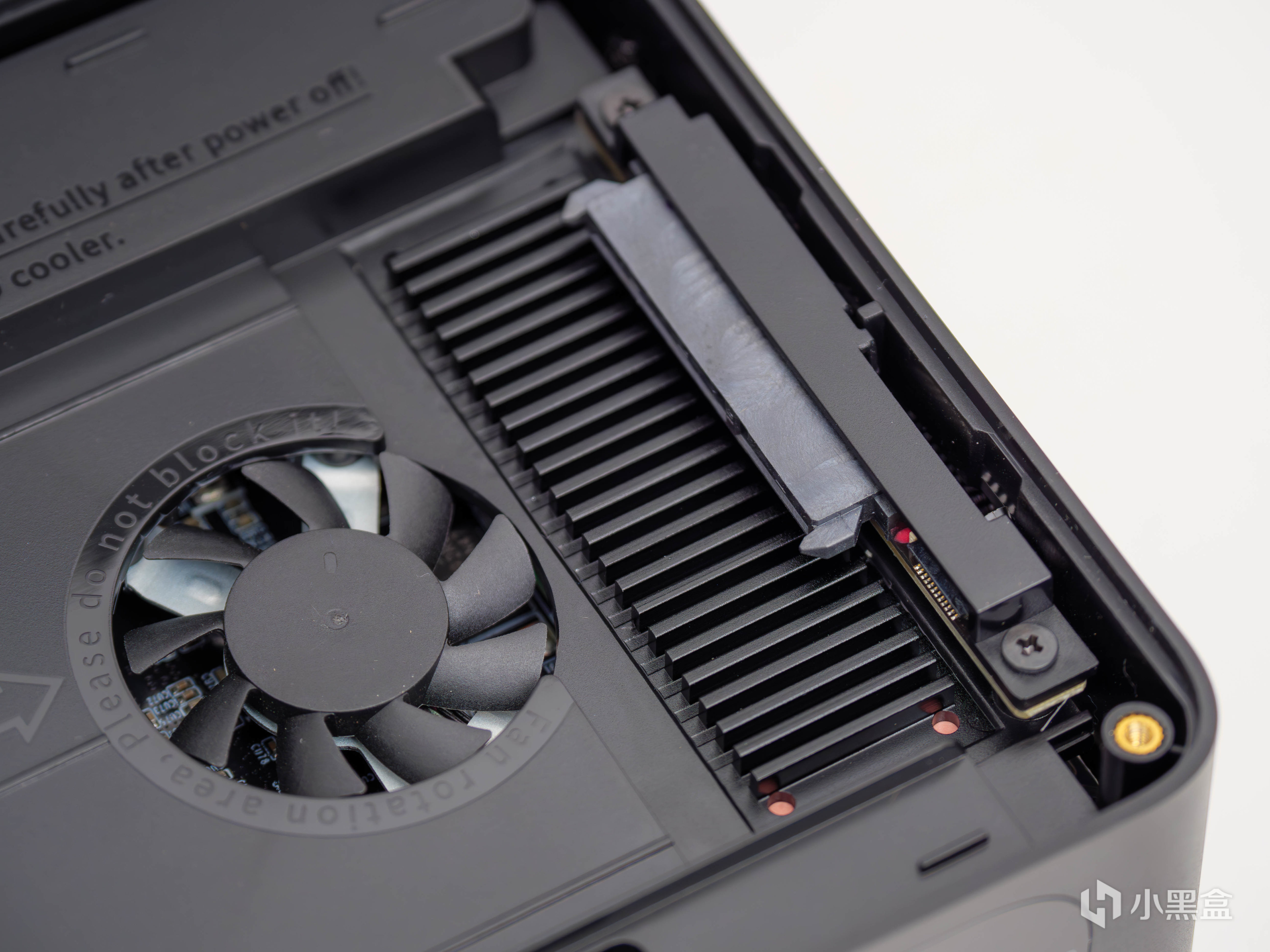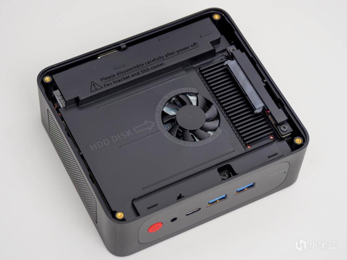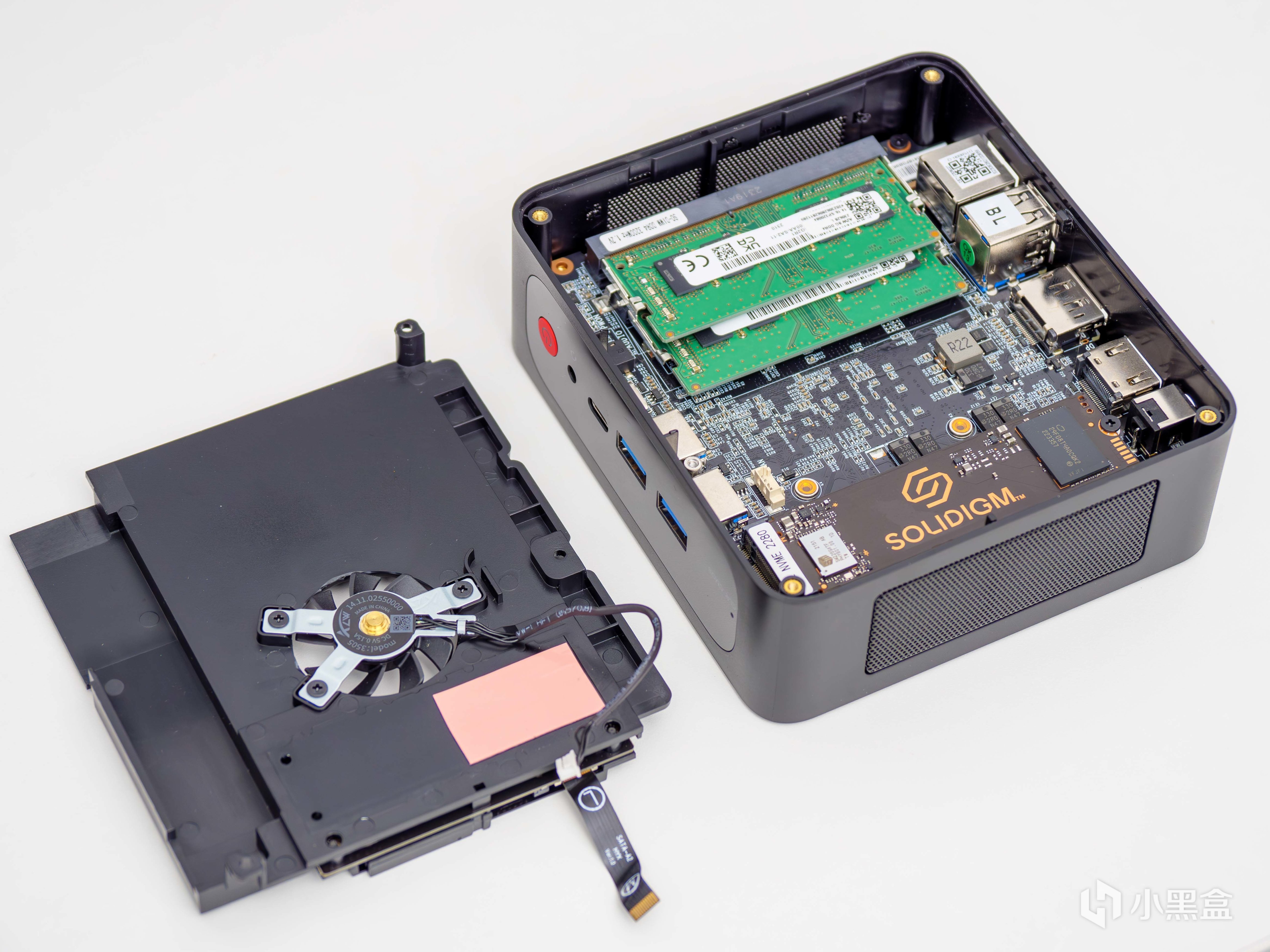 出于好奇我拆开看了下,底壳打开后就能看到2.5寸SATA硬盘的接口,并且在中层面板上还有个小风扇,负责为SSD、内存和主板进行吹风散热,这对于空间狭小的迷你主机来说还是挺有必要的。