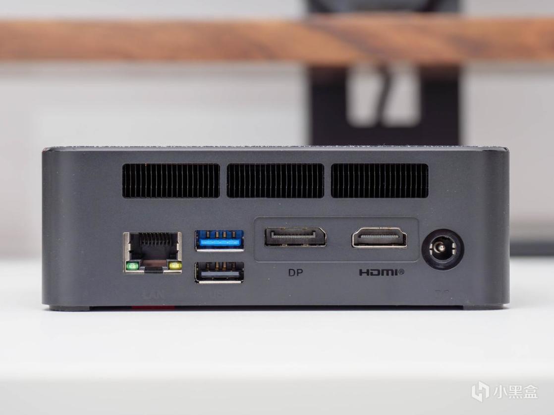 后置接口要更加丰富些,包含1个千兆有线LAN口,1个USB3.2 Gen2 Type-A接口,1个USB2.0接口,以及DP1.4和HDMI2.0视频输出接口。这样配合前面板的Type-C的话,这台迷你主机最多可以实现三屏同时显示的效果。