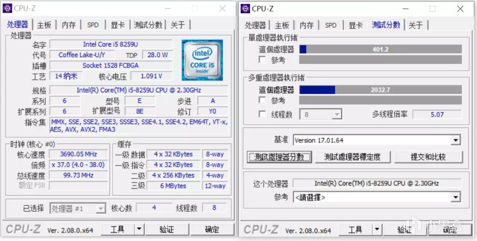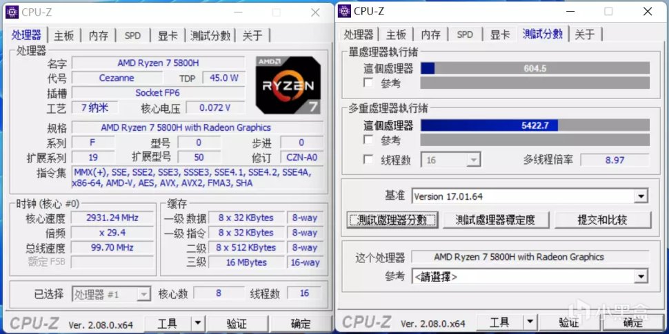 AMD 5800H虽然是ZEN3架构,但是性能方面还是要比NUC8的i5-8259U强多了,这一点从CPU-Z的跑分就能看出来。
