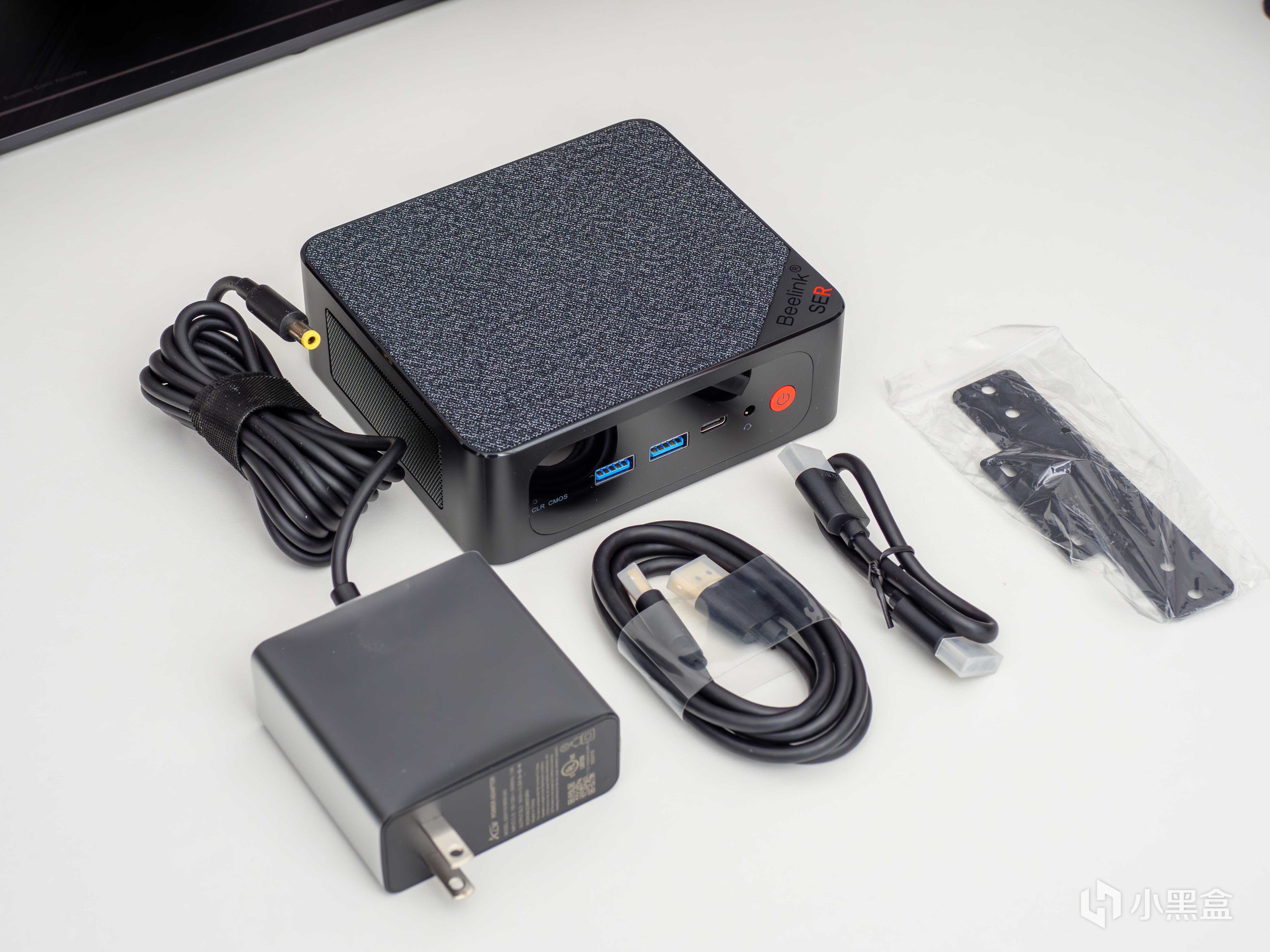 我选择的是比较低调的曜石黑配色版本,开箱后包含零刻SER5 MAX本体、电源适配器、显示器挂架和一长一短两根HDMI线材。两根线缆的设计还是蛮贴心的,要是把迷你主机挂到显示器背后使用的话,HDMI短线正好可以方便隐藏整理。