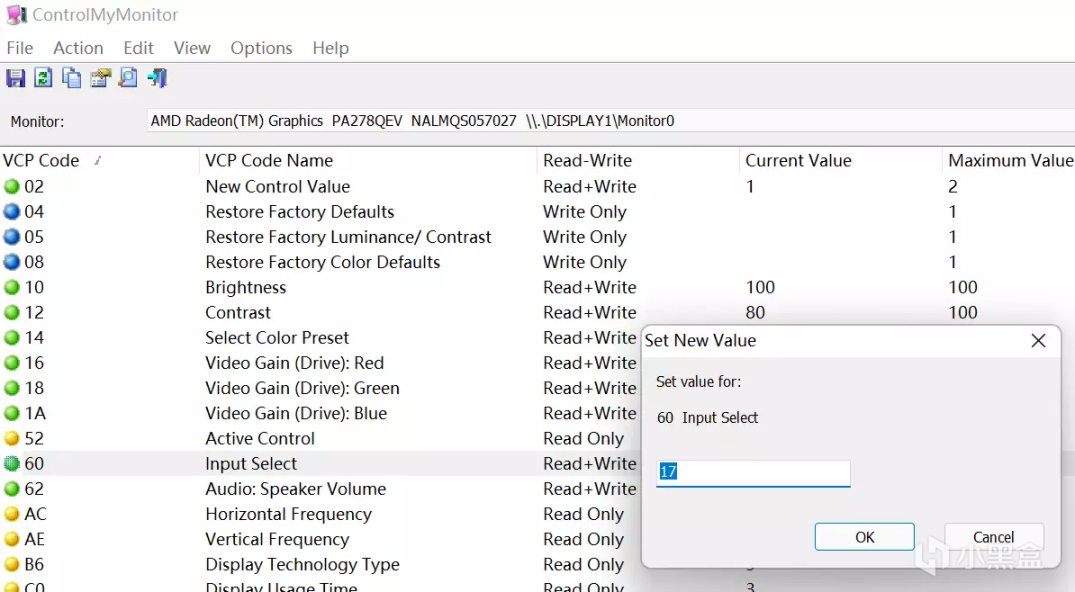 如果想要确定每个数值对应的是哪个接口的话,可以手动改变值来查看结果(该操作其实就相当于按显示器的OSD实体键来切换输入源)。